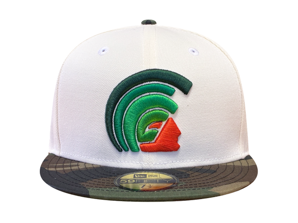 R DIVISION – FITSTRIKE EXCLUSIVENEW ERA 59FIFTY FITTEDPOLYESTER | COTTONCHROME / WOODLAND CAMOORANGE NE FLAGSTANDARD FIT, SIZES 7-8